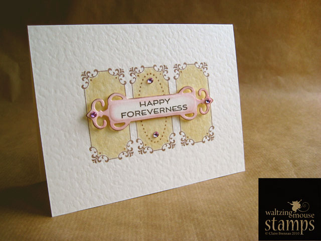 In today's final card I stamped the sentiment "Happy Foreverness" onto a tag shape and sponged a little ink, gorgeous Distress velvet ink! yum! I then stamped 3 panels onto the card base using another of the frames from Fancy Phrases and some Memento Rich cocoa ink. I colored the panels in by making a mask, see the following photos for directions, it is super simple with this frame shape. I added a dotty oval frame (also from Fancy Phrases) and some bling before mounting the tag front and centre. I think it makes a decent wedding/anniversary card!