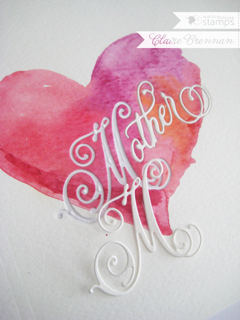 I cut a plain white Mother shape out of some of the same watercolour paper and set it back into the die cut heart - a few dabs of glue was all it took. Once it was all well stuck down I rubbed over the whole surface gently with a little scrunched up kitchen paper to remove any little papery wisps and to further bed the die cut in place. Loved it! AND I have a lovely spare pinky watercoloured sentiment now to use on another project! Hope it tickles!