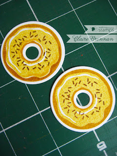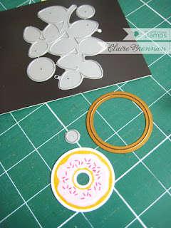 In every release I have there is always 'The Problem'. Sometimes it's a late stock delivery, sometimes it's a realisation that I didn't order enough of a particular items and sometimes, (ok, only once ever) it's the realisation that I didn't order a particular item at all.... How red faced was I, chasing up the die folks, only to realise that the order email, for the dies for this set were...ahem...still in my draft folder.... doh. Hoping to have the dies for next release, in the meanwhile it's Spellbinders to the rescue for the overall doughnut shape and the mini circle die from the Simple sprig die set is just the right size for the doughnut holes...phew...