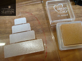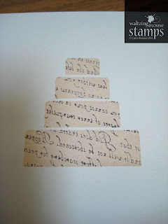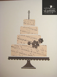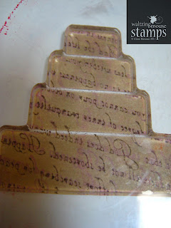 Next, ink up a background stamp - I used a script stamp from Text-It for this cake - but you could use a plaid maker stamp, a polka dot stamp, anything with a closely knit pattern on it should do.