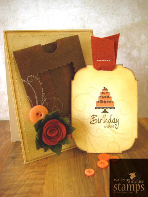 I stamped it with a little flourish from the new Flourishes Scallops and dots set. The card background pattern is stamped with the long border from Eat Cake.