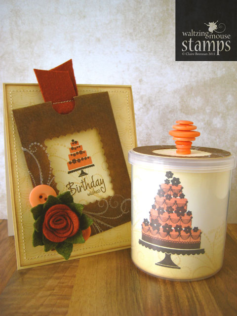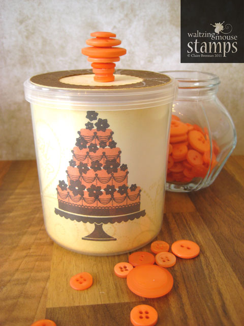 Oh my wee tub! do you like the wee button knob? I got myself a wee hot glue gun earlier this week! How have I lived without it???? it's fab! I glued a stack of buttons together to make a little handle for the top of my tub. It's probably more decorative than functional, as the tub lid id very tight, but I thought it was cute!. I made an 'inner' for the clear plastic tub from some cardstock that I stamped with a big cake, and some flourishes. I really went to town on my big cake, I thew all the decs on it, the icing, the flowers and the cake band, ooh and the cake stand! but I did manage to keep them all the same colour! lol.