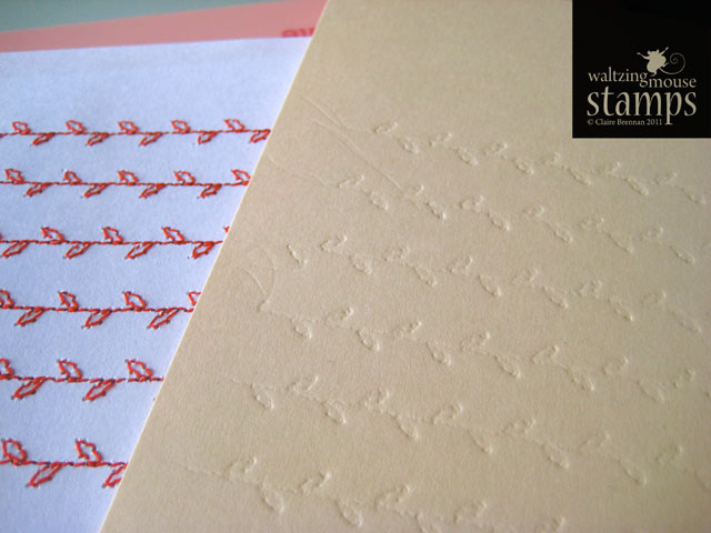 What I got was a lovely homespun texture!! You can see the actual stitching on he left and the embossed texture on the right. Here's a tip - if you fancy trying this, do your stitching on as thin a piece of paper as you can, that way they can't 'hide' in the paper when you are trying to emboss the onto a piece of thicker cardstock.