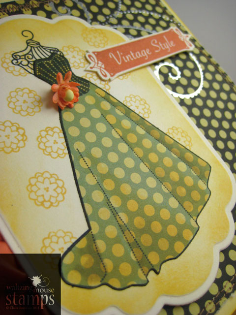 Perfectly suited to vintage or modern, I love it. On my first card above, I paper pieced the dress, and then I stamped one of the extra bodice pieces on top of the paper piecing. You can see the bodice is stamped in black and has a little dotted detailing recalling the boned contours of a vintage corset. I used copics to colour the skirt. I trimmed out the dress with a Labels 11 die shape (Spellbinders) and sponged the edges with a yellow gold before removing the die cut from the die.