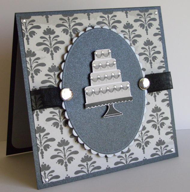 Genevieve created this elegant wedding card using Eat Cake. She included the perfect amount of sparkle (love all the rhinestones on the cake!) and paired it with some beautiful damask patterned paper. Sophisticated all around, and so perfect for a wedding!