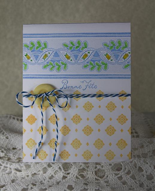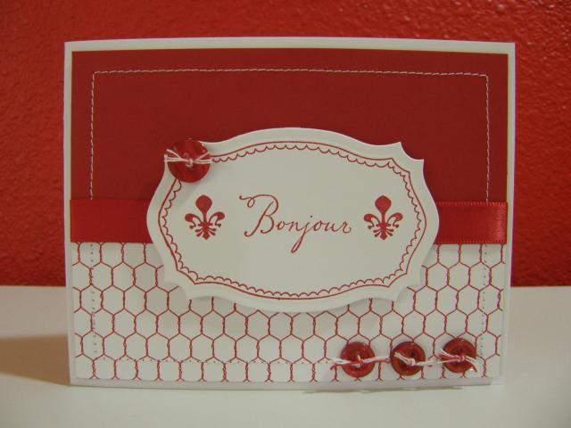 Cathy W created this adorable onesie using images from the French Country set. With the addition of those sweet pearls, it’s totally girli-fied. She added one of the small roosters stamped within a Join Us leafy circle image and her sentiment from the Compact Sentiments set. What new mommy wouldn’t love to receive such an adorable and creative card?!