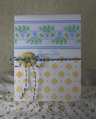 And last, but not least, Claire Apostoloff created this lovely engagement card showcasing how these label images can easily become intricate and interesting backgrounds for a focal image. The label image and sentiment is from the Fancy Phrases set. The die cut heart is perfect for this card.