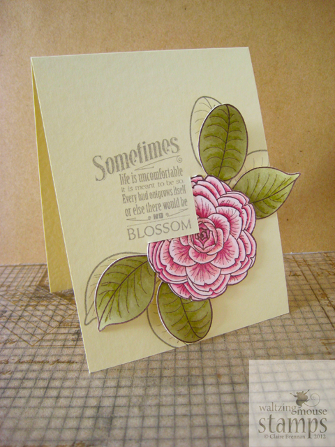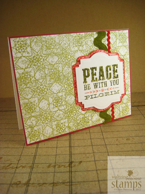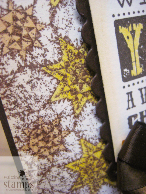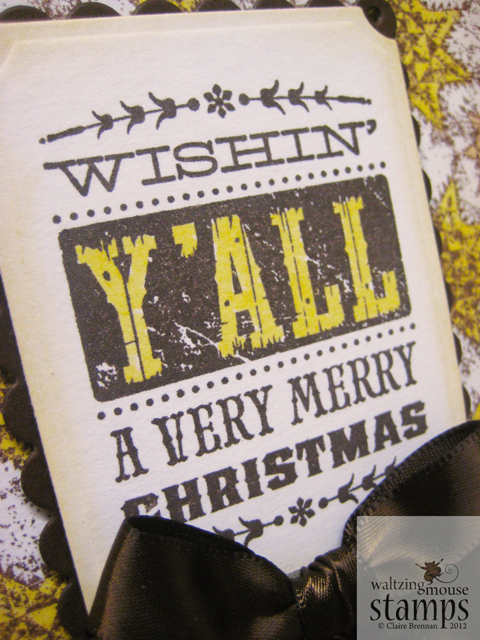 I threw together another card, to give you a better look at that big background stamp - Yonder Star Background. I stamped it in green on white and loved how fresh it was. Teamed it up with a sentiment from Yonder Star, and was tickled to discover that I could pick out details on the stamp in other colours when I used two of those fancy Distress Markers that everyone is raving about...expect to see more of this, I love how the little decorative detail is picked out in red between the green words. This was very easy with the markers.