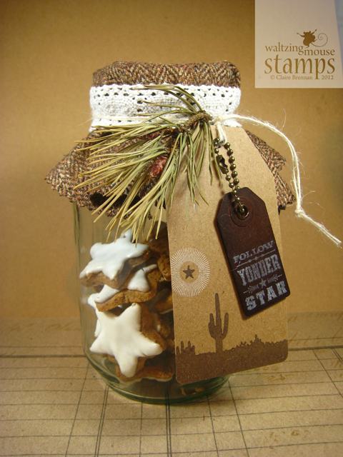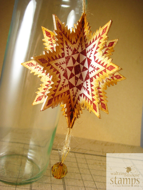 I just stamped the star in SU Cherry Cobbler onto the cut out shapes and literally threw some distress ink (Brushed Corduroy, I believe) on with a stencil brush, I found this much faster than sponging each individual piece. Some twine and a little bead to give it weight....easy peasy lemon squeezy...This would also make an awesome gift adornment.