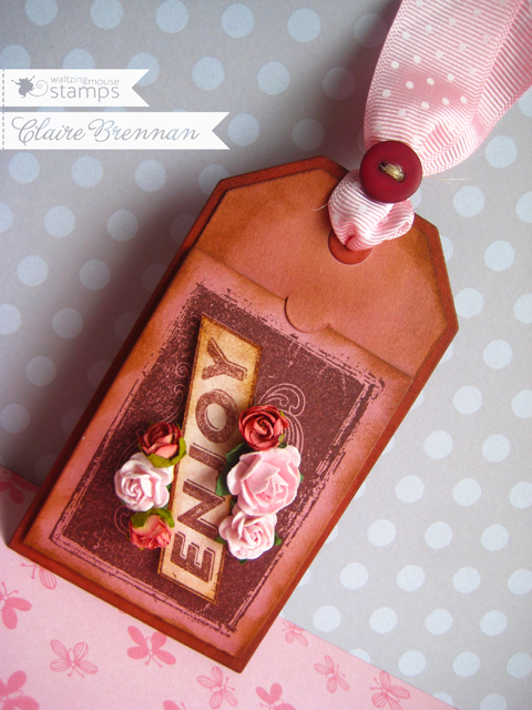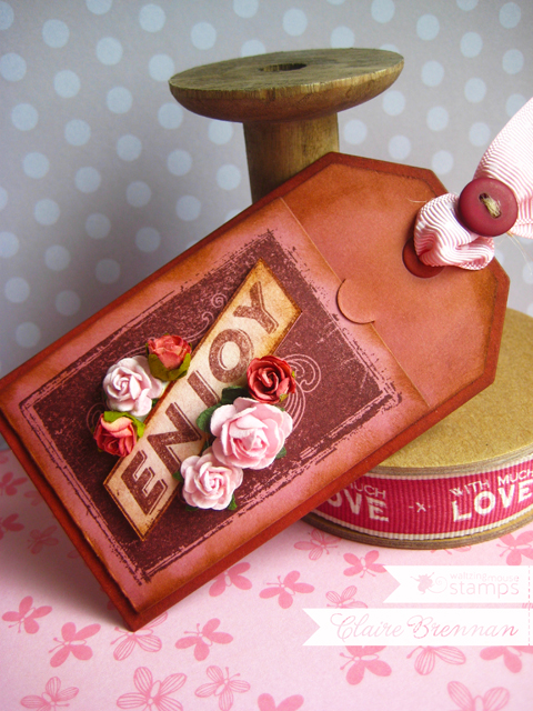 I stamped the Enjoy image from the new Tag Collection 1 set onto the front of the folded tag. I stamped the image again onto cream card and simply cut out the enjoy shape, I popped it up on foam tape and added a few flowers, much sponging was done first tho...
