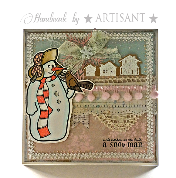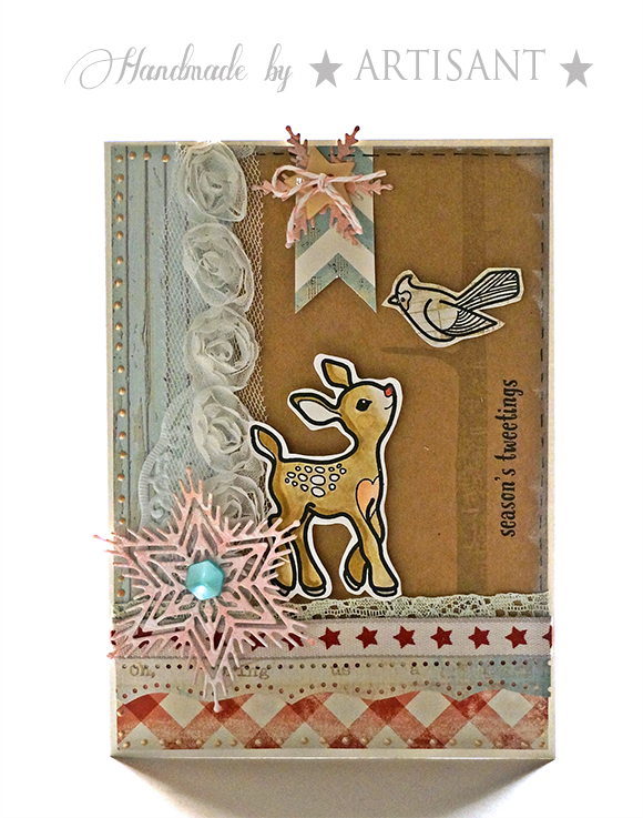 Folk Art Snowflake die to cut out a flake and then ran the flake through my Calibur with a tan mat and a piece of white card to emboss the flake pattern onto the white card. I sponged a little to highlight, before using it as the background for my card.
