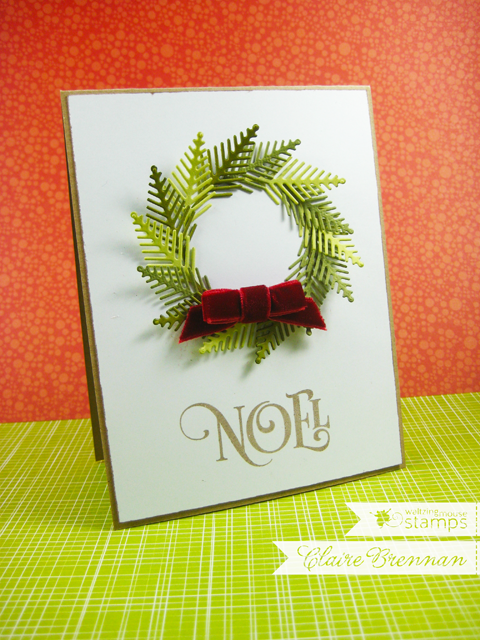 I'm not done with yesterdays snowflake yet either, this has to be one of the most versatile flakes I've seen. I cut three flakes from different shades of green and then snipped off the little 'tree' shapes - I used these to make a quick wreath on this simple card. Hard part was tying that tiny bow in velvet.