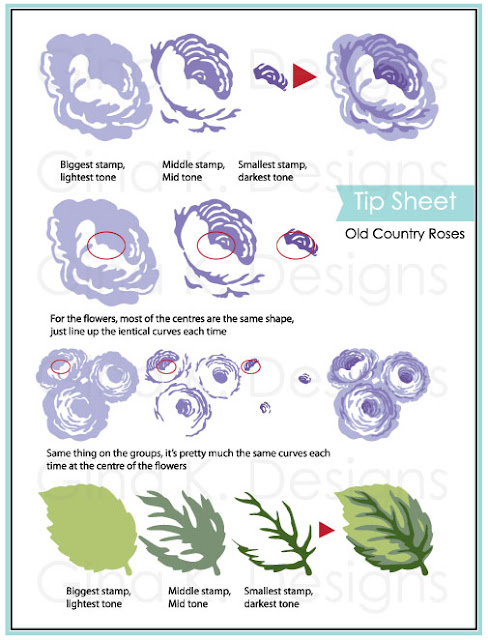 Old Country Roses is a layering set and I have prepared a tip sheet to help you see how simple it is to line these stamps up - some folks worry about alignment, but I purposely designed these to be super simple - all of the lining up is done on the centre of each bloom - here's the tip sheet: