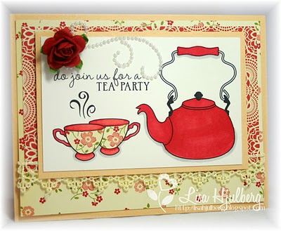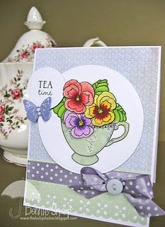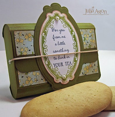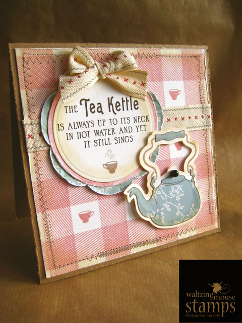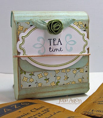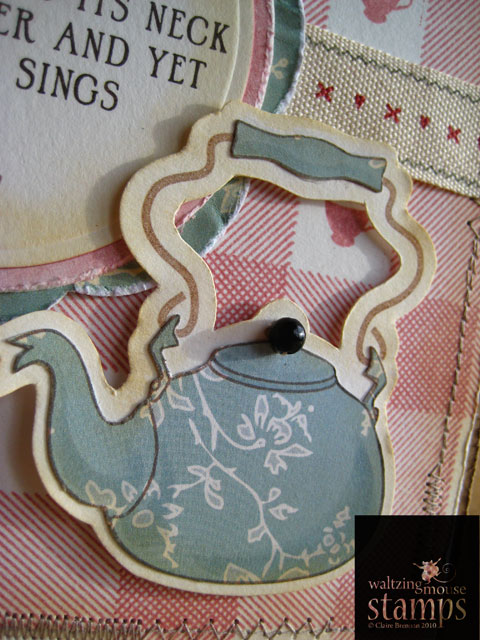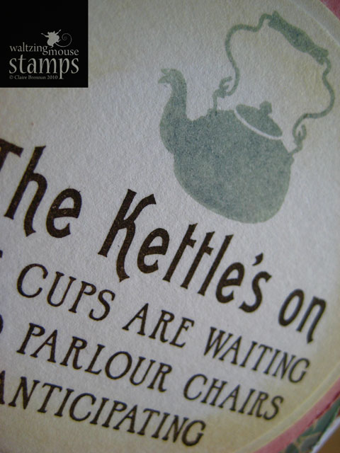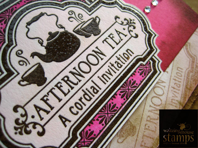 Well since Tea is my liquid of choice I chose to make my card with our Afternoon Tea stamp set. Since I'm literally prepping tomorrows new release, I chose to stamp my main label image in Versamark onto watercolour paper, I then sprinkled on clear embossing powder and heat set it. I used watercolour paints to fill in the negative parts of the label image. It's a bit of a cheat really as the clear embossing resists the paint and it makes it look almost as though I just painted that dinky label by hand! I trimmed out the label and mounted it onto a tag (Waltzingmouse Stamps - Stitched tag dies, see here).