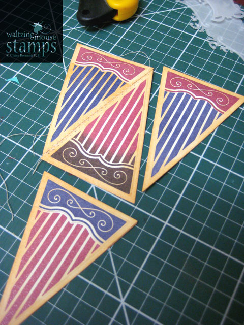 I love the clear embossing powders used over coloured inks - see the sheen on the little banner stamps.
